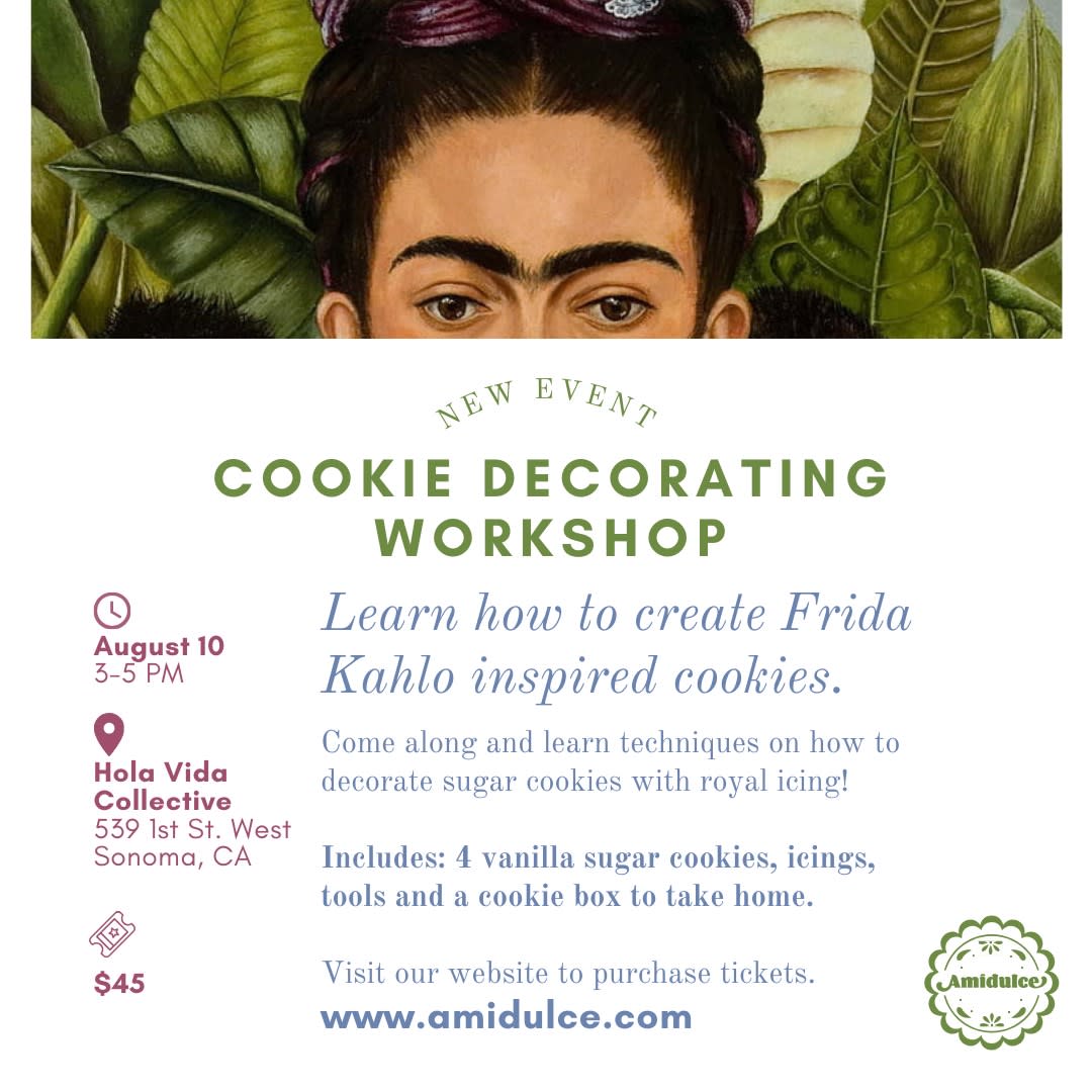 Learn how to create Frida Kahlo inspired cookies! Come along and learn techniques on how to decorate sugar cookies with royal icing! Includes: 4 vanilla sugar cookies, icing, tools and a cookie box to take home! Visit our website to purchase tickets, ($45/pp), www.amidulce.comImages