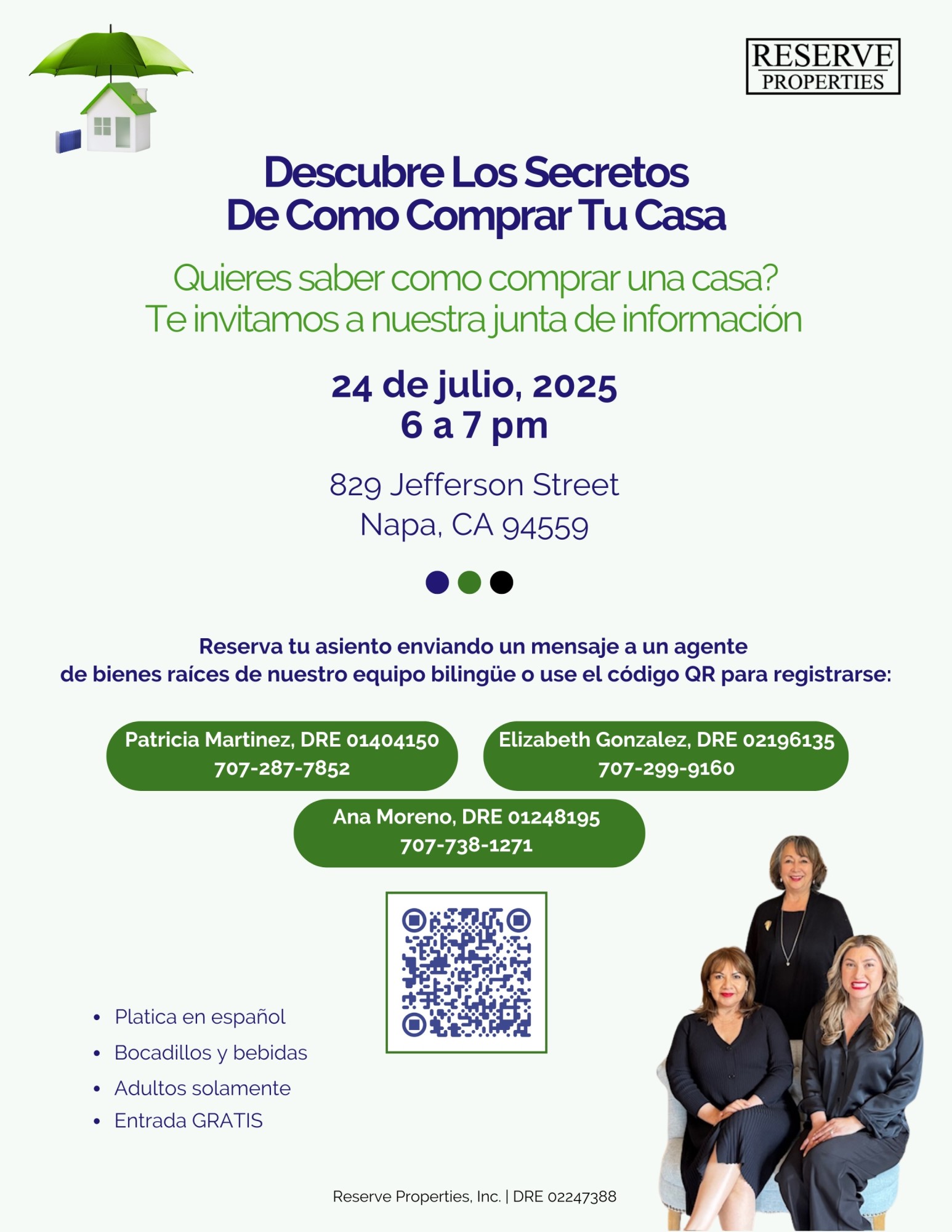 Descubre Los Secretos De Como Comprar Tu Casa. Quieres saber como comprar una casa? Te invitamos a nuestra junta de información: 24 de julio, 2025. 6 a 7 pm. Acompáñanos en un evento especial en español diseñado para informar y empoderar tanto a compradores primerizos como a quienes ya tienen experiencia! Aprende todo sobre el proceso de comprar una casa — desde el financiamiento y el crédito hasta cómo hacer la mejor oferta — todo presentado en español por profesionales confiables del sector inmobiliario. Esta es tu oportunidad para obtener respuestas de expertos, hacer preguntas y dar el siguiente paso con confianza hacia ser dueño de tu hogar.