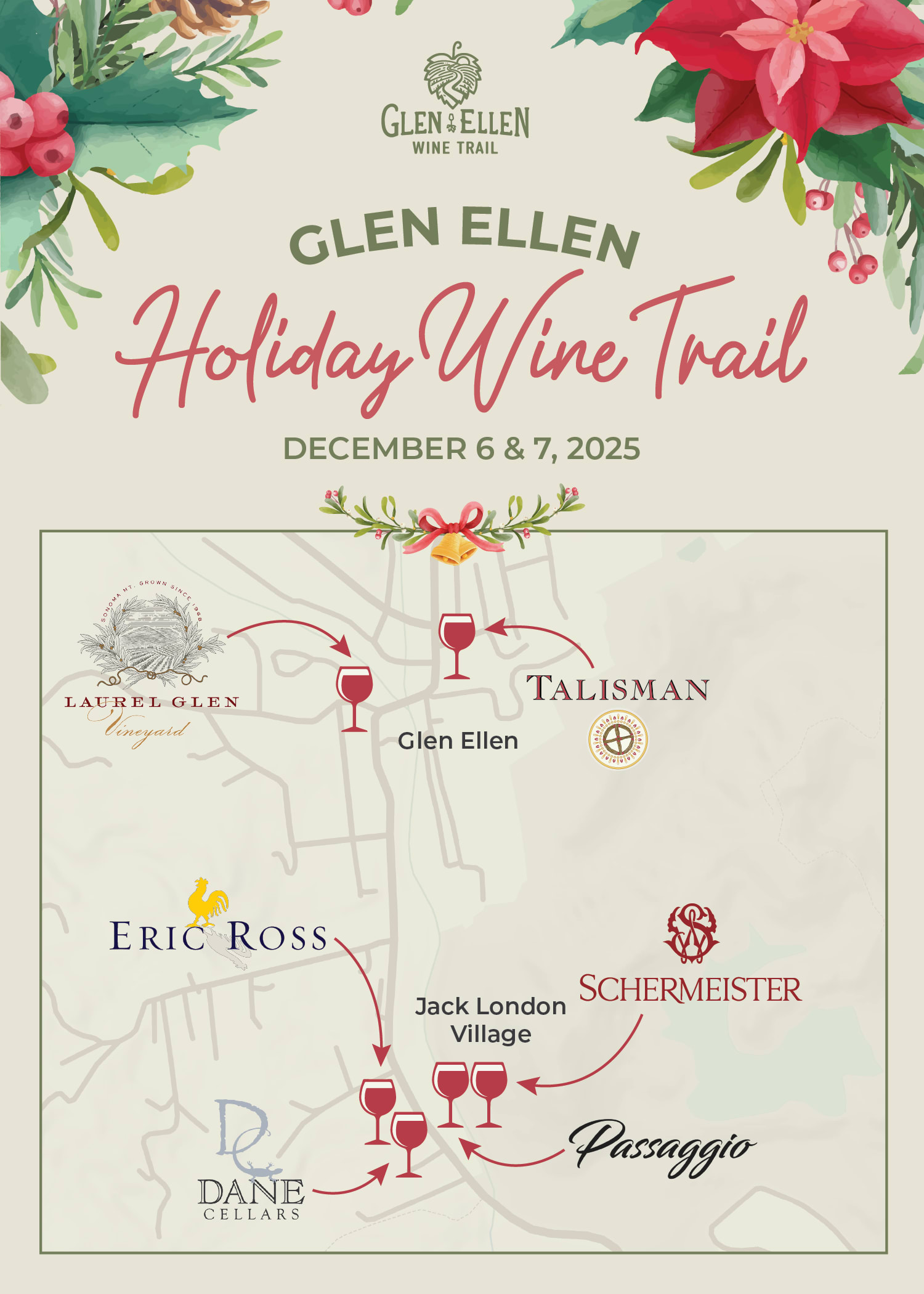 Glen Ellen Holiday Wine Trail Saturday & Sunday December 6th & 7th, 2025 11:00 am - 4:00 pm Explore the small wineries of Sonoma Valley on this one-mile stretch through Glen Ellen! Taste at 6 limited-production winery tasting rooms, shop local artisan wines, and pick up gift cards for the wine lovers in your life. A Special Weekend in Glen Ellen Includes: • $25 Curated Wine Tastings at 6 Small Wineries • • Gifts & Gift Cards Available at Each Tasting Room • $25/per person at each individual winery Pay at the door. For more information and to register for this event, go HERE!
