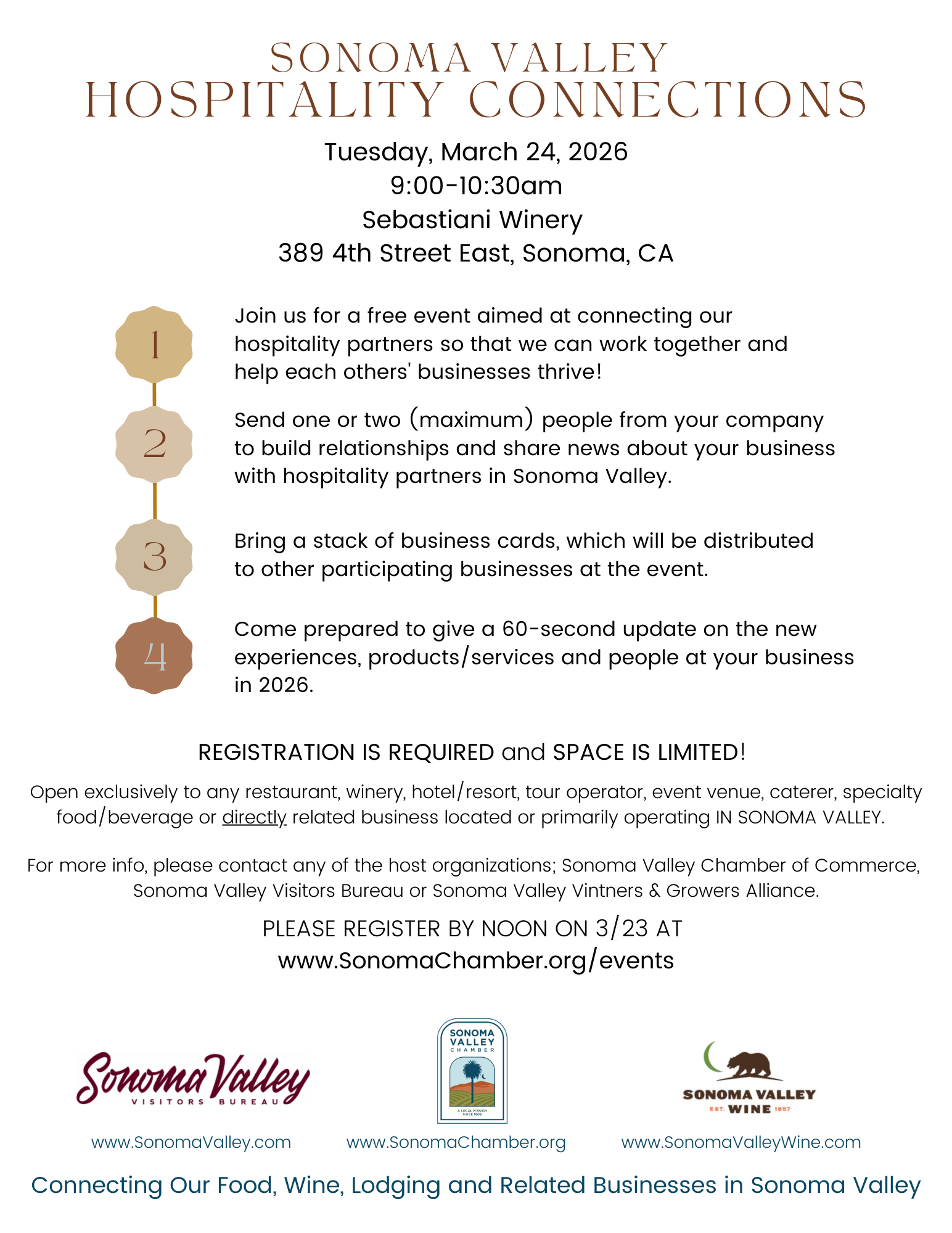 - Registration priority will be given to members of one (or more) of Sonoma Chamber, SVVB or SVVGA.