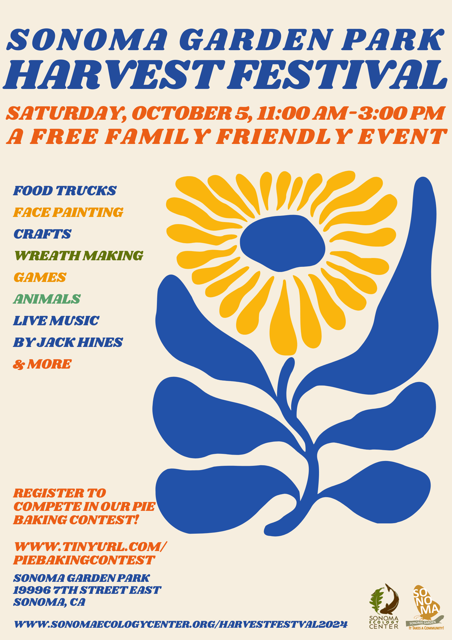 Save the Date! Saturday, October 5th 11:00am-3:00pm A FREE family friendly Event! Food trucks, face painting, crafts, wreath making, games, live music by Jack Hines and MORE! Join us for this incredible event! For more information you can go to the Sonoma Garden Park website!