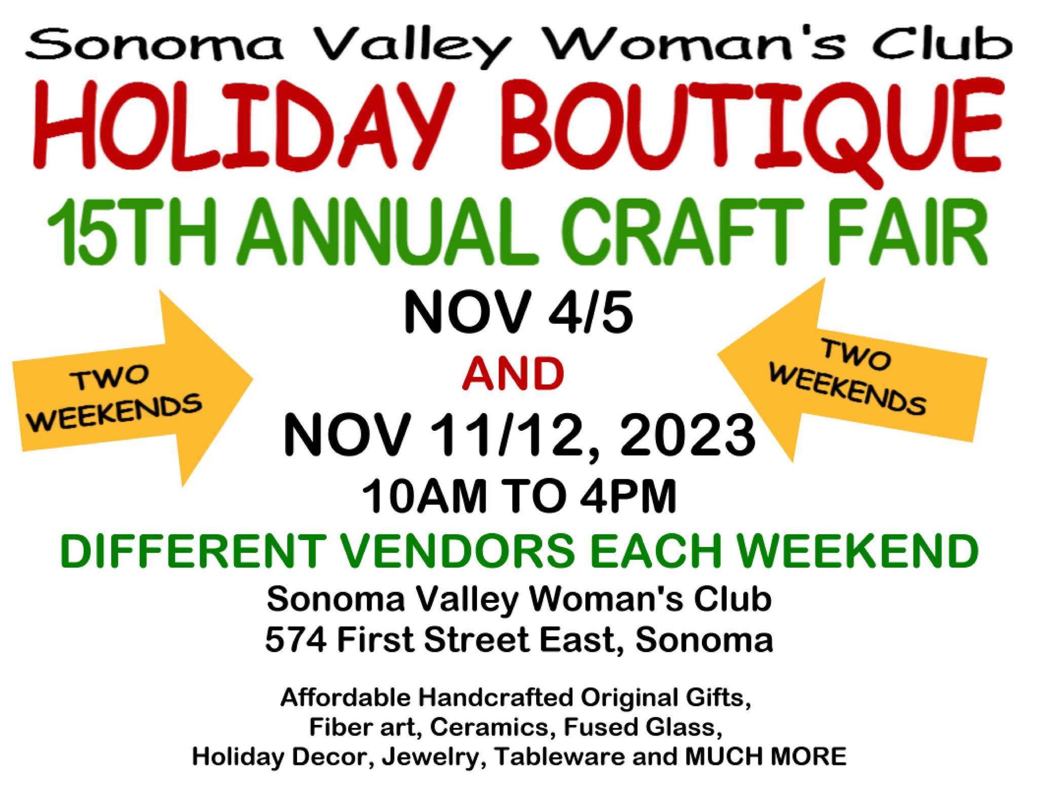 It's the 15th annual Holiday Boutique Craft Fair at the historic clubhouse, one-half block from the Sonoma Plaza, located at 574 First Street East. The boutique is being held on TWO consecutive weekends with different artisans each weekend from 10 am to 4 pm.
