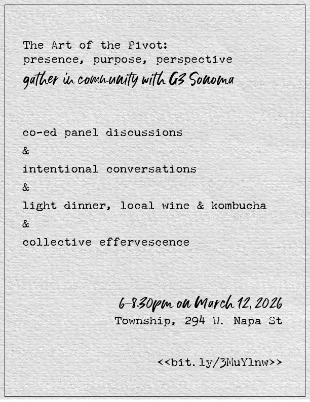The Art of Pivot: presence, purpose, perspective gather in community with G3 Co-ed panel discussion & intentional conversations & light dinner, local wine and Kombucha & collective effervescence 6-8:30pm on March 12th 2026 Township, 294 West Napa Street Get your tickets HERE!